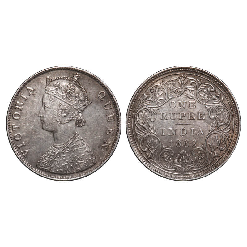 Victoria Queen, Silver, Rupee, 1862, Madras Mint, B/II, With enclosed frame effect and with re-engraving in hairs. F. Prid 57. GK 267. About Uncirculated. Very Scarce.