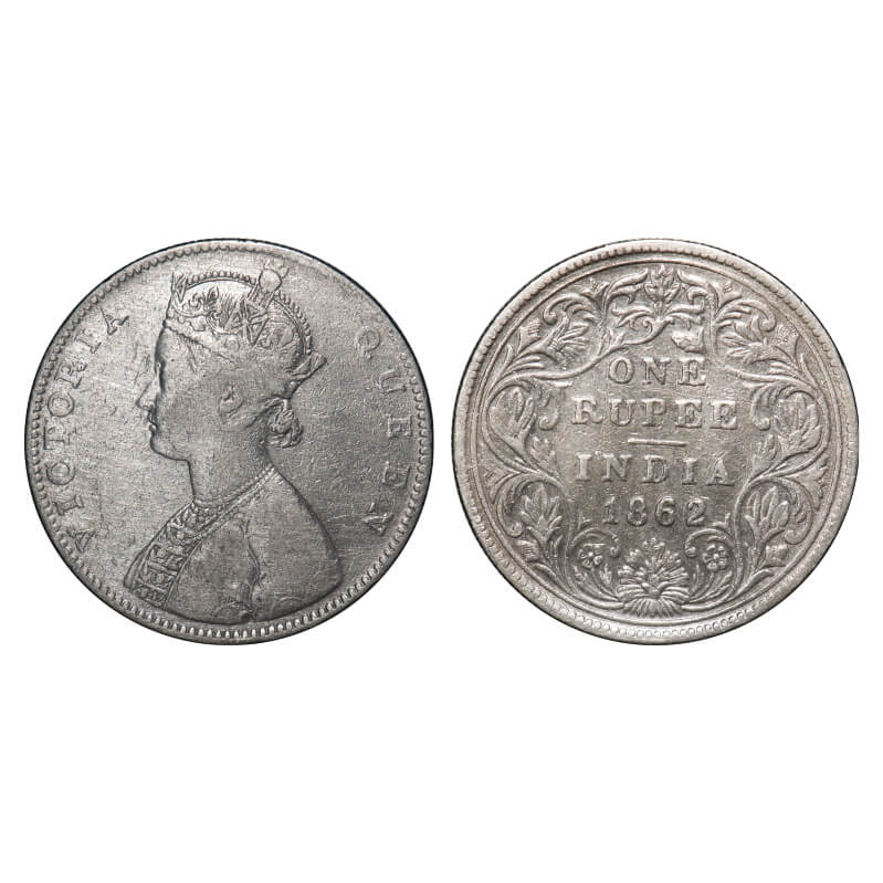 | Victoria Queen, Silver, Rupee, 1862, Bombay Mint, D/II, The Queens jabot has 5 panels, This Obv is from L. C. Wyon's revised die of 1863 pattern Rupee, Also know as Experimental Coinage, Flower above 'E' of One normal size. F. Prid 59. GK 276. Very Fine. Very Scarce. |