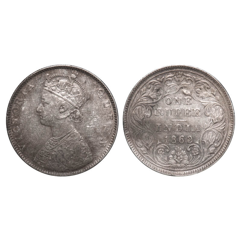 | Victoria Queen, Silver, Rupee, 1862, Bombay Mint, D/II, The Queen's jabot has 5 panels, The Obv is from L. C. Wion's revised die of 1863 Pattern Rupee, An Experimental Coinage in Bombay Mint. F. Prid 59. GK 276. Very Fine+, Toned. Very Scarce. |