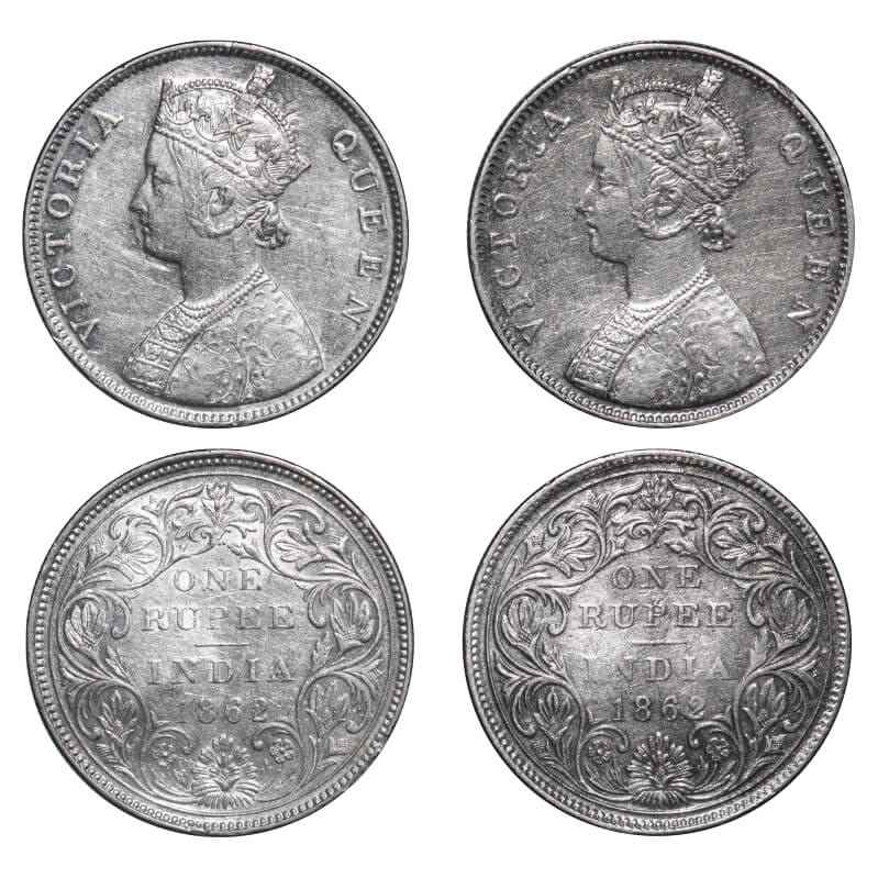 | Victoria Queen, Silver, Rupee, (2 coins), 1862, Bombay Mint, 1) B/II/1/0, 2) B/II/2/0. F. Prid 69, 71. GK 286, 287. Very Fine+ to Extremely Fine+. Very Scarce. |