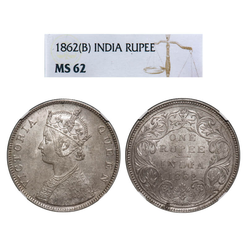 Victoria Queen, Silver, Rupee, 1862, Bombay Mint, B/II/2/0. F. Prid 71. GK 287. NGC Slabbed MS 62. Rare.
