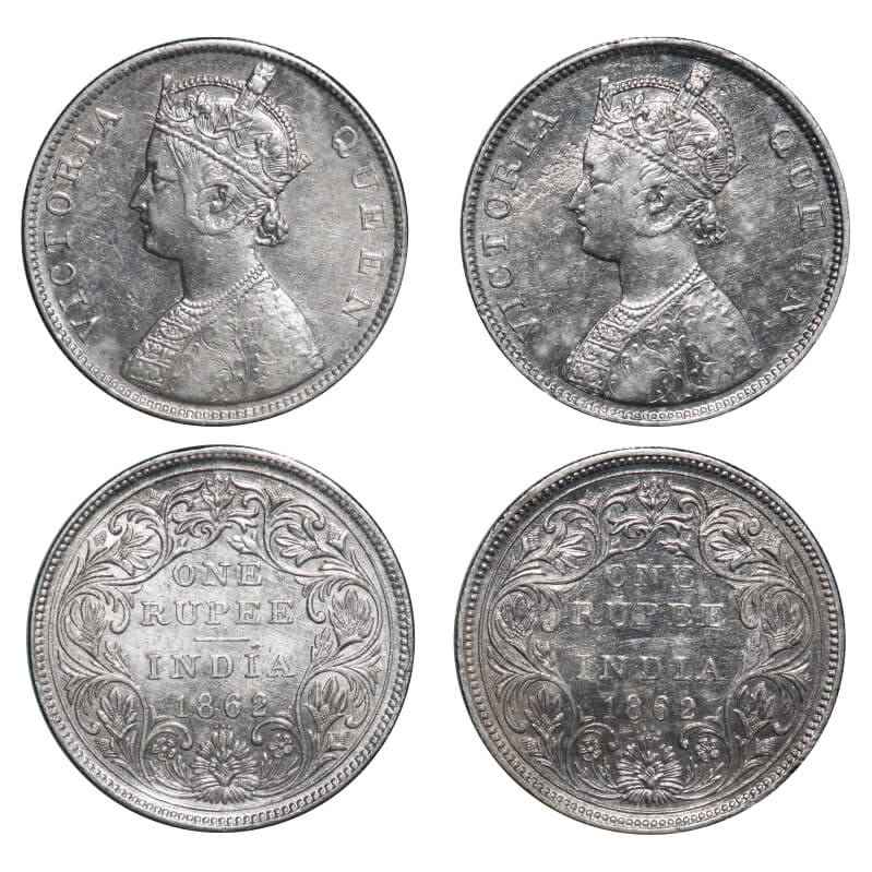 | Victoria Queen, Silver, Rupee, (2 coins), 1862, Bombay Mint, 1) B/II/0/3, 2) B/II/0/4. F. Prid 77, 81. GK 300, 310. Very Fine+ to Extremely Fine+. Rare. |