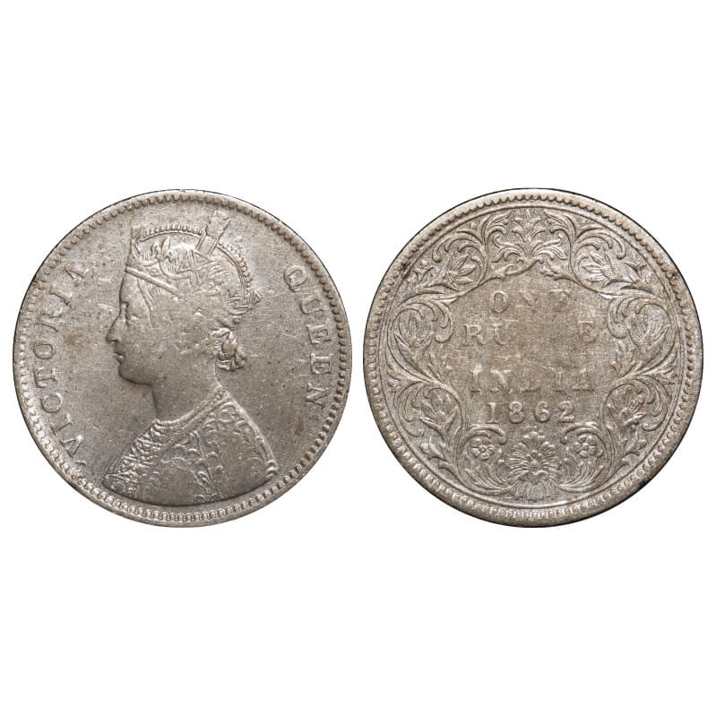 | Victoria Queen, Silver, Rupee, 1862, Bombay Mint, A/I/0/4, w/o initial 'J', With round Pearls on the Crown, The 4 dots placed are in large size. F. Prid. 78. GK 305. Very Fine. Very Scarce. |