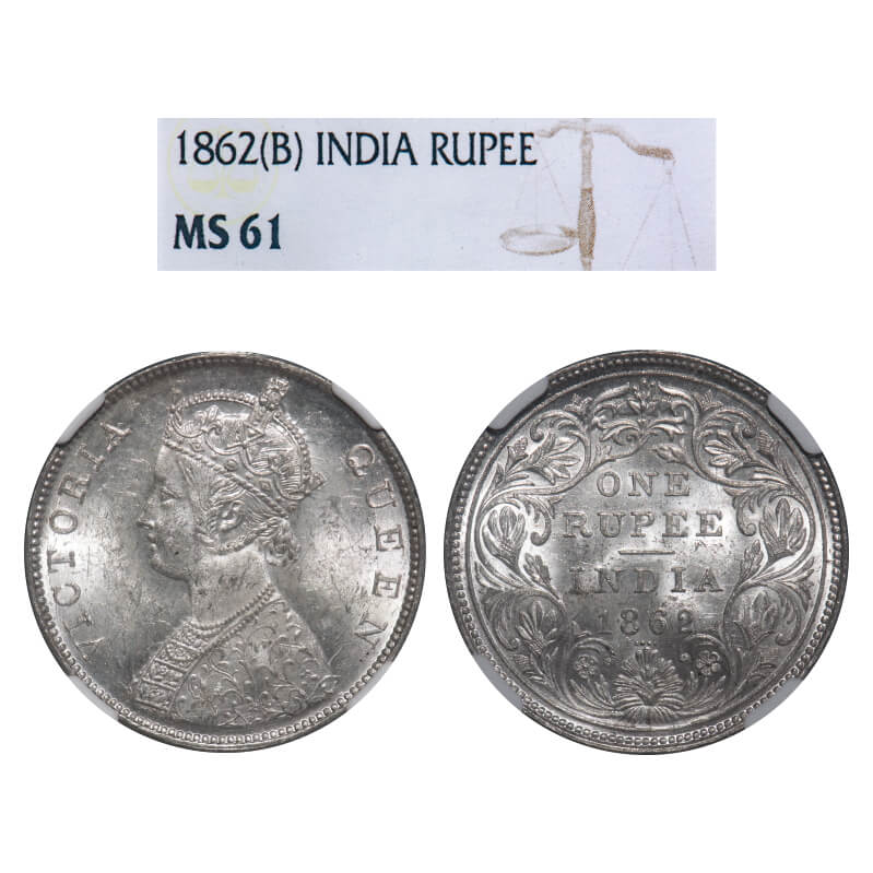 Victoria Queen, Silver, Rupee, 1862, Bombay Mint, B/II/0/4, 4 dots arranged are in a horizontal straight line. F. Prid 81. GK 310. NGC Slabbed MS 61. Very Rare.