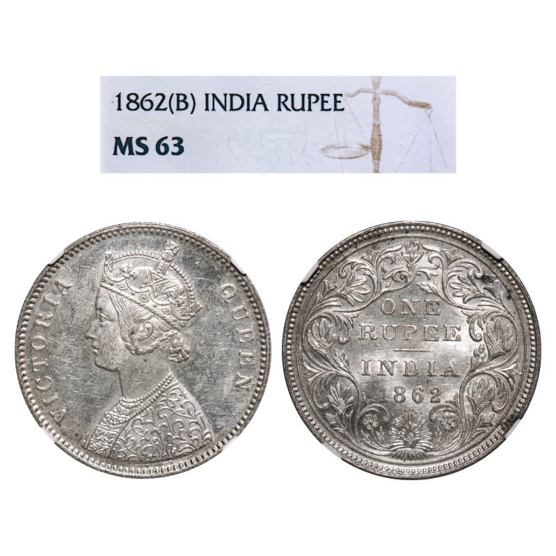 Victoria Queen, Silver, Rupee, 1862, Bombay Mint, A/II/0/5, w/o initial 'J', Complete 'D' in India. F. Prid 85. GK 316. NGC Slabbed MS 63. Extremely Rare.
