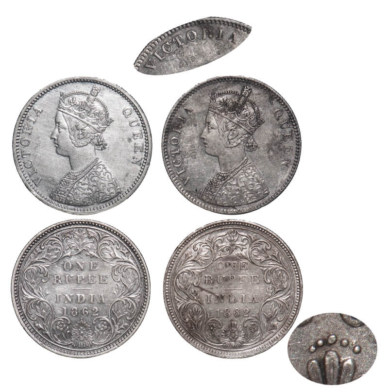 | Victoria Queen, Silver, Rupee, (2 coins), 1862, Bombay Mint, 1) A/II/0/5, Broken 'D' in India, w/o initial 'J', Crudish legends on 2nd 'I' & 'A' of Victoria, A micro dot between 4th & 5th dot, 2) A/I/1/1, With initial 'J', The whorl in the bottom flower has altogether a different design. F. Prid 85 Type, 98. GK 317 Type, 347. Extremely Fine+ to About Uncirculated. Very Scarce. |