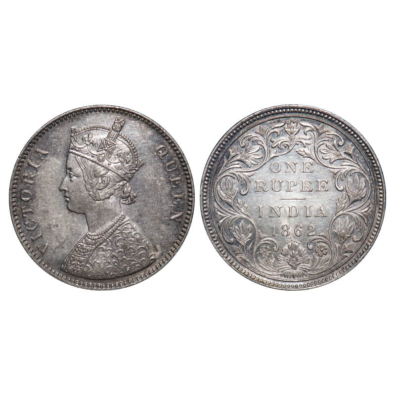 | Victoria Queen, Silver, Rupee, 1862, Bombay Mint, A/II/0/6, w/o bottom stroke of numeral 1, w/o initial 'J', Broken bottom curve of numeral 8. F. Prid. 86. GK 323. Almost Uncirculated. Very Scarce. |