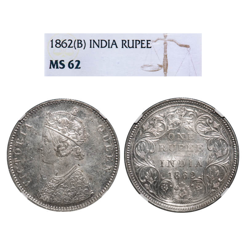 Victoria Queen, Silver, Rupee, 1862, Bombay Mint, A/II/0/7, w/o initial 'J'. F. Prid 87. GK 329. NGC Slabbed MS 62. Very Rare.