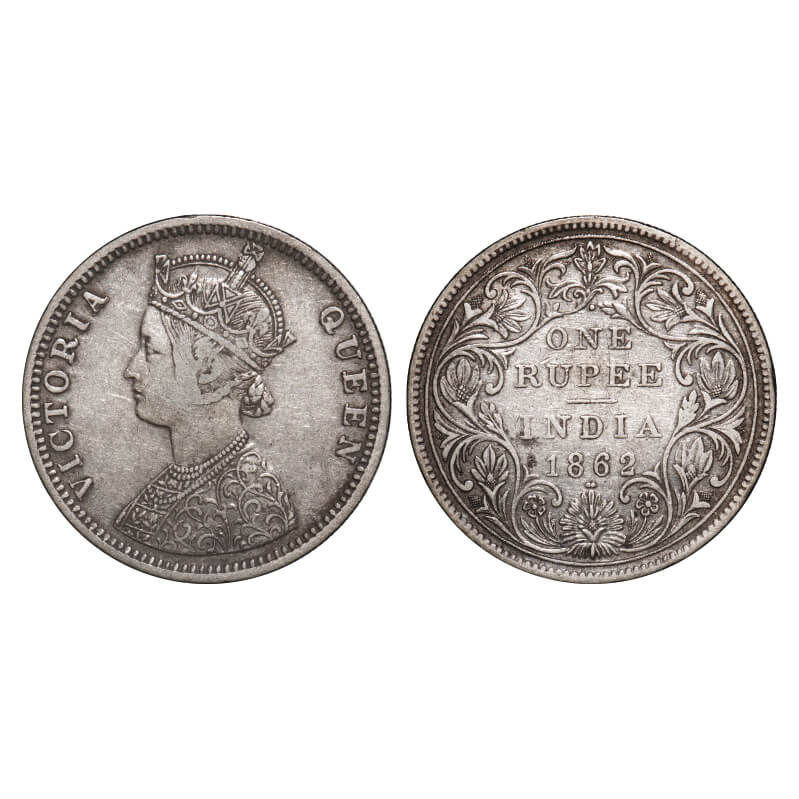 Victoria Queen, Silver, Rupee, 1862, Bombay Mint, C/II/1/2, Dots at the bottom flower are very close to each other. F. Prid 105. GK 360. Extremely Fine. Rare.