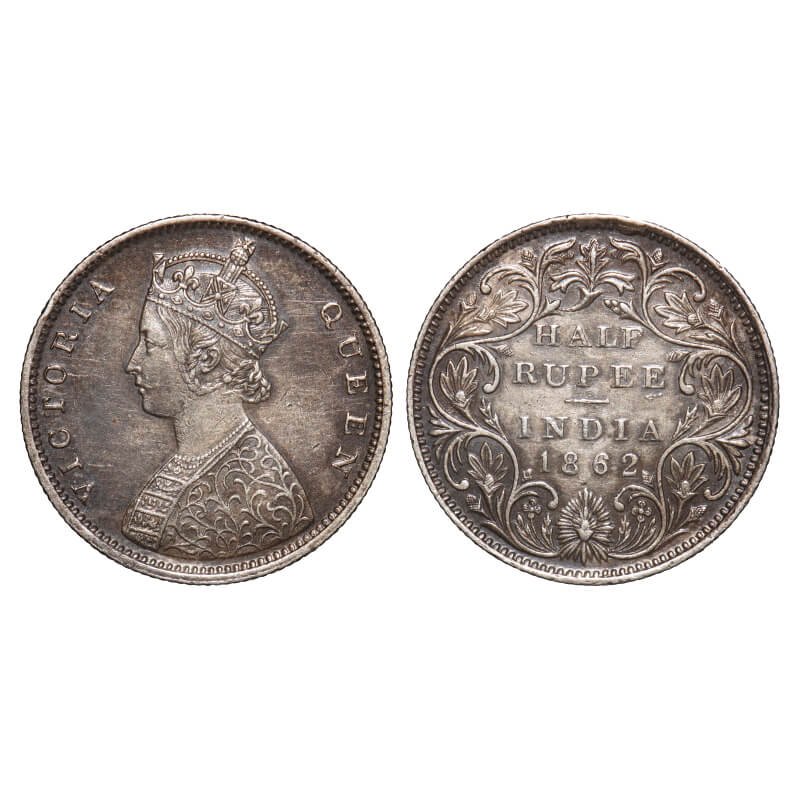 | Victoria Queen, Silver, Half Rupee, 1862, Bombay Mint, B1/II, Round Pearls, 5 petals flower has raised veins in centre of the petals. F. Prid 258. GK 371. About Uncirculated, Toned. Rare. |