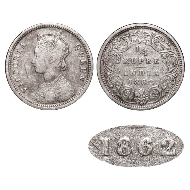 Victoria Queen, Silver, 1/4 Rupee, 1862, Madras Mint, A/I, Error, 1st letter 'I' in Victoria looks like numeral 1 (short horizontal serif type). F. Prid 378A. GK 378. Very Fine. Rare.