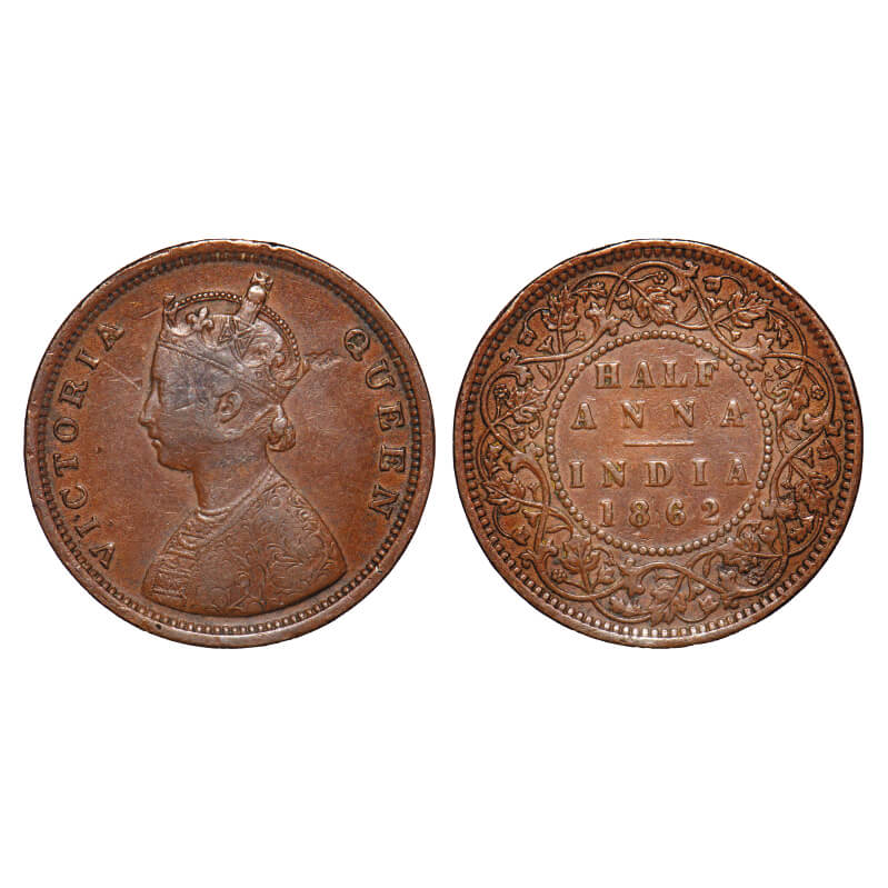 | Victoria Queen, Copper, Half Anna, 1862, Calcutta Mint, A/II, The Queen's jabot has 4 & 1/2 panels, The numeral 1 of year has a short horizontal serif, Planchate flaw on Obv, Pineapple like flower buds. F. Prid Unlisted. GK 387. Very Fine. Rare. |