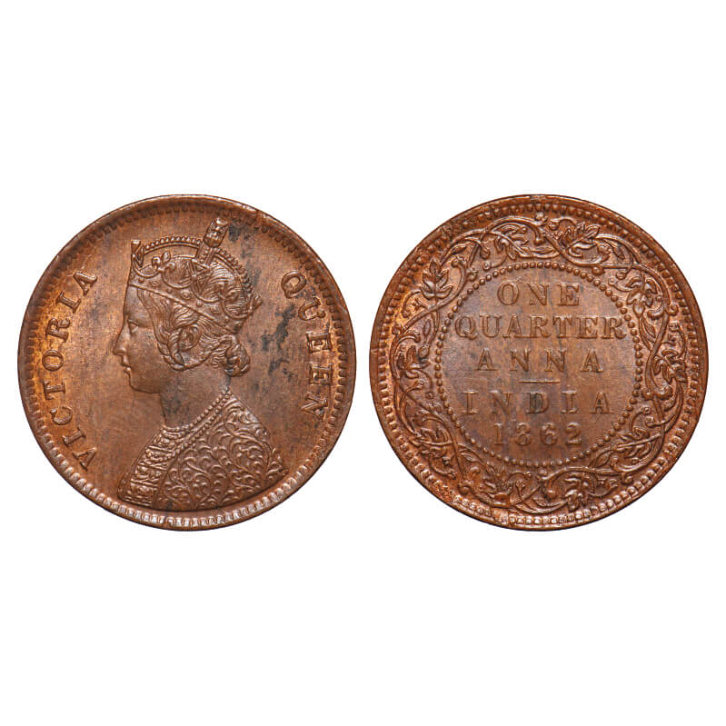 | Victoria Queen, Copper, Quarter Anna, 1862, Bombay Mint, A/I, Tiny V incused, No mint mark, Alphabate 'N' of One is broken in Rev, Alphabate 'A' of Victoria has a low relief horizontal bar, Looks like inverted V. F. Prid 602. GK 397. Brilliant Uncirculated. Rare. |