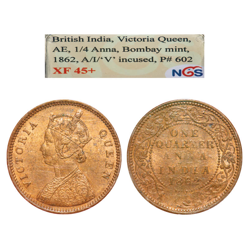 Victoria Queen, Copper, Quarter Anna, 1862, Bombay Mint, A/I, Tiny V incused, No mint mark. F. Prid 602. GK 397. NGS Slabbed XF 45+. Very Scarce.