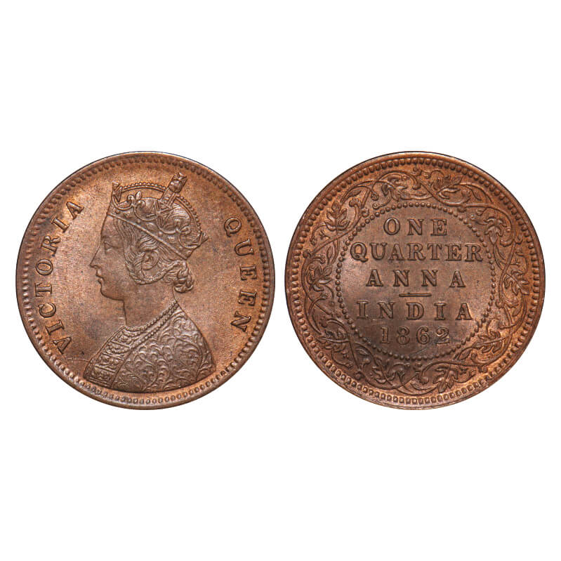 | Victoria Queen, Copper, Quarter Anna, 1862, Madras Mint, A/I, No mint mark, No privy mark, Die crack on Obv. F. Prid 604. GK 399. Uncirculated. Very Scarce. |