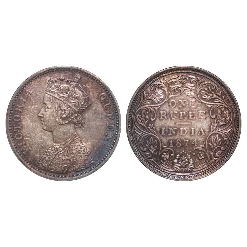 | Victoria Queen, Silver, Rupee, 1874, Bombay Mint, A2/II, No dot, Normal numeral 4. F. Prid 142. GK 410. Uncirculated, Toned. Very Scarce. |