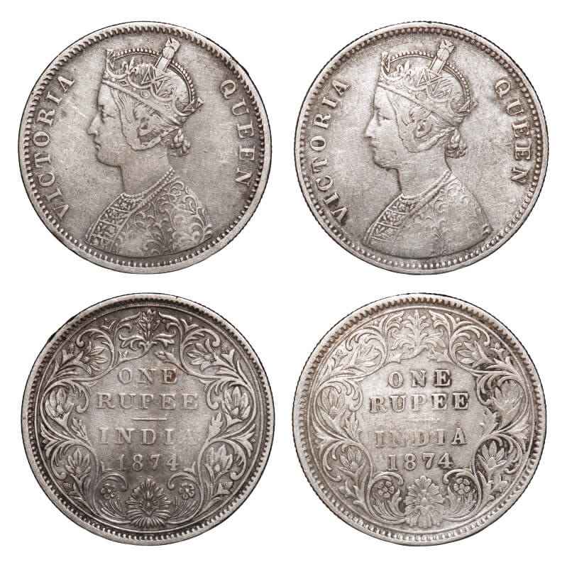 | Victoria Queen, Silver, Rupee, (2 coins), 1874, 1) Bombay Mint, A2/II, No dot, Normal numeral 4, 2) Calcutta Mint, A1/I, No mint mark. F. Prid. 142, 112. GK 410, 418. Very Fine+ to Extremely Fine. Very Scarce. |
