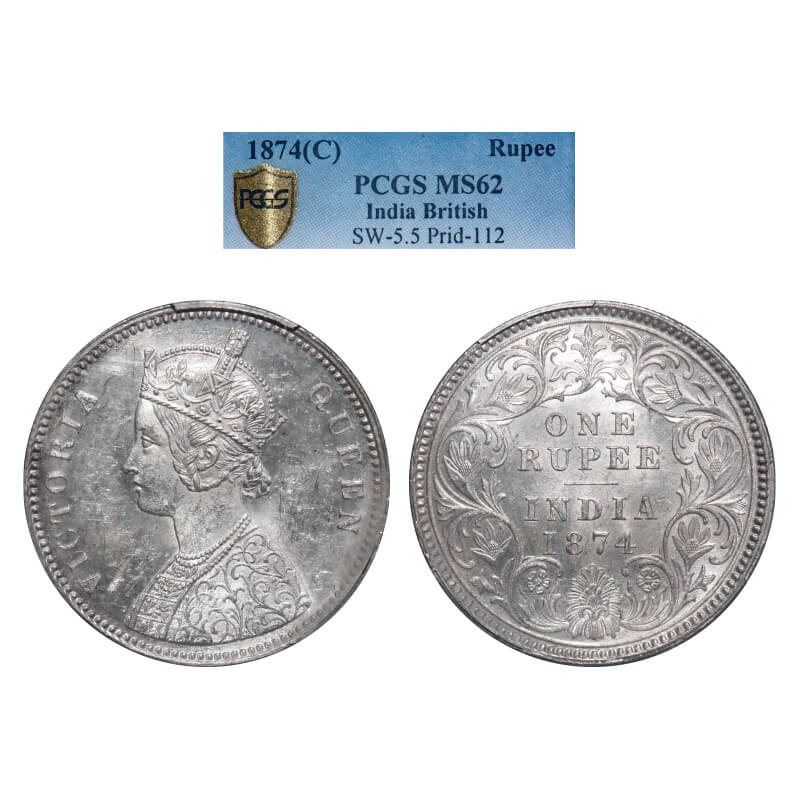 Victoria Queen, Silver, Rupee, 1874, Calcutta Mint, A1/I, No mint mark, The 1st numeral 1 in year date 1874 looks like letter 'I' ( a short horizontal serif type). F. Prid 112. GK 418 Type. PCGS Slabbed MS 62. Extremely Rare. (2 coins graded higher by PCGS in this category till 10/9/2025)