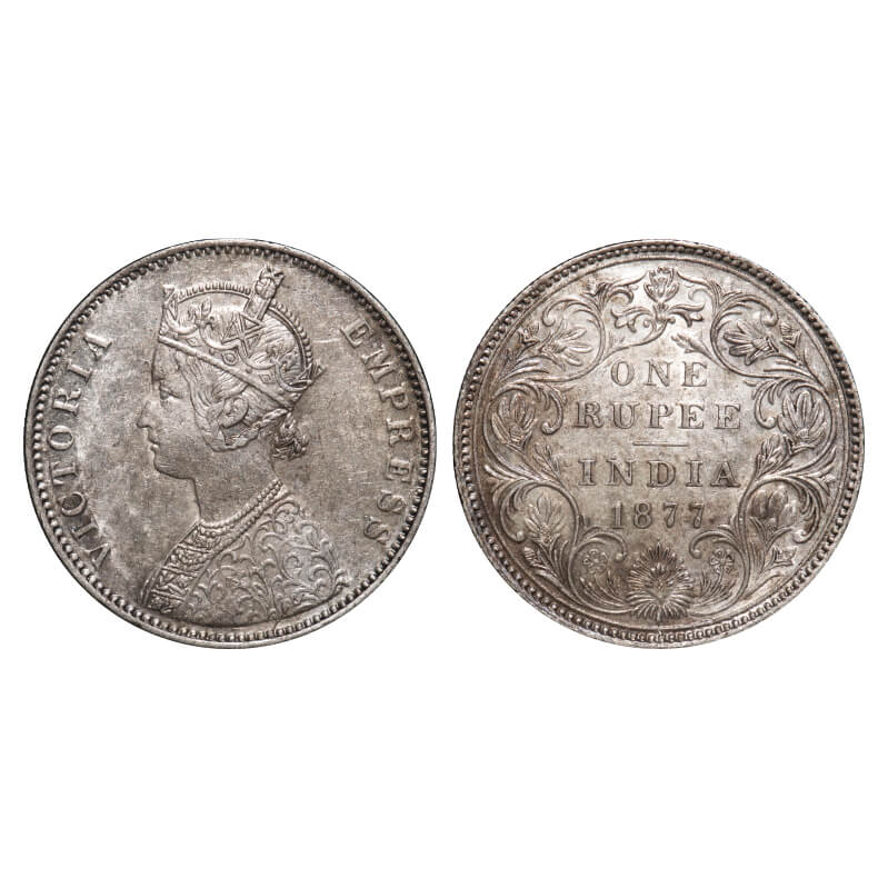 | Victoria Empress, Silver, Rupee, 1877, Bombay Mint, A3/II(i), Dot, Thin numeral 77, The Queen's jabot has 3 & 3/4 panels, Privy mark, Initial 'J' raised and 'V' seen, die cracks on Obv. F. Prid Unlisted. GK 441. About Uncirculated, Toned. Very Scarce. |
