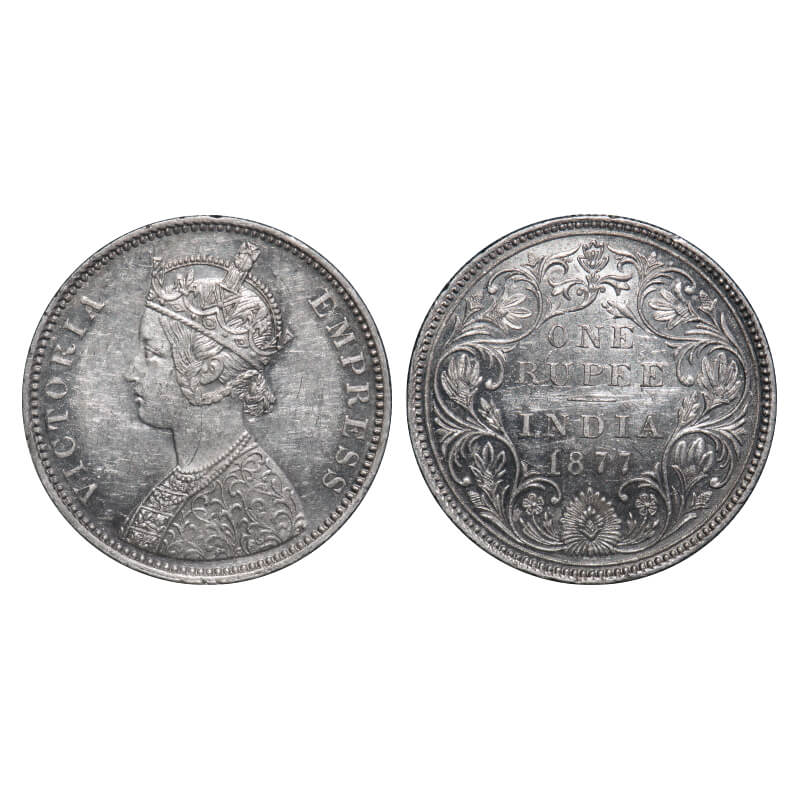 Victoria Empress, Silver, Rupee, 1877, Bombay Mint, A3/II(i), Dot, Thin numeral 77. F. Prid Unlisted. GK 441. Uncirculated. Very Scarce.