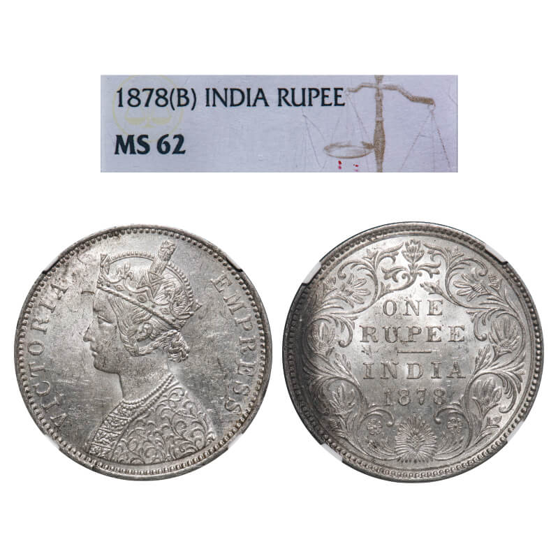 Victoria Empress, Silver, Rupee, 1878, Bombay Mint, A3/II(i), Dot. F. Prid 151. GK 451. NGC Slabbed MS 62. Very Rare.