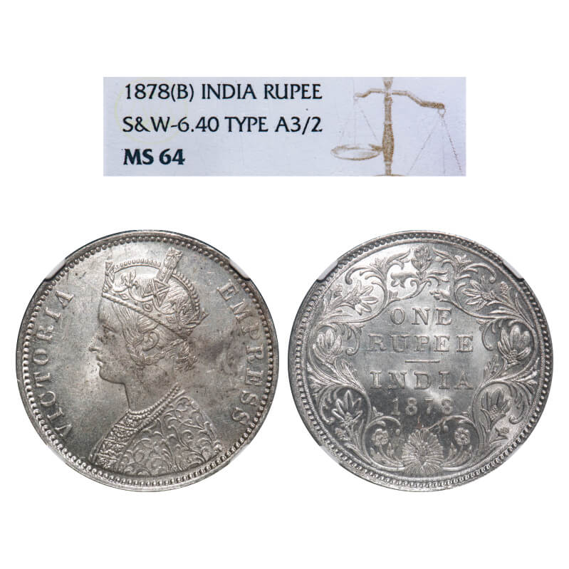| Victoria Empress, Silver, Rupee, 1878, Bombay Mint, A3/II(ii), Dot, The flower above 'O' of One has a Pineapple like bud which is not there in on Rev II. Paul Stevens & Randyweir 6.40, F. Prid Unlisted. GK 453 Type. NGC Slabbed MS 64. Exceedingly Rare. (2 other coins graded higher by NGC in this category till 10/9/2025) |