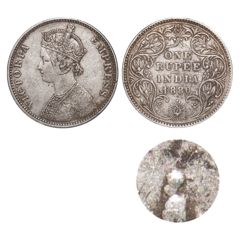 | Victoria Empress, Silver, Rupee, 1880, Bombay Mint, A3/II(iv), Dot, Mechanical die doubling of dot placed above bottom flower, due to which 2 dots one big and one small are seen. F. Prid Unlisted. GK Unlisted. Extremely Fine. Very Rare. |