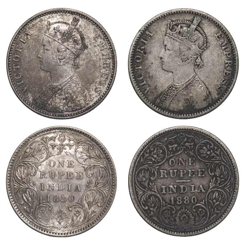 | Victoria Empress, Silver, Rupee, (2 coins), 1880, Bombay Mint, 1) A3/II(i), Dot, 2) A3/II(iv), Dot. F. Prid 155, Unlisted. GK 465, 467. Very Fine to Extremely Fine+. Very Scarce. |