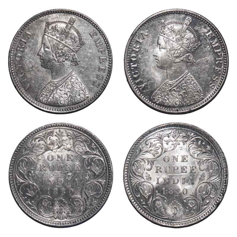 | Victoria Empress, Silver, Rupee, (2 coins), 1880, 1) Bombay Mint, A3/II(iv), Dot, 2) Calcutta Mint, A1/I, 'C' incused. F. Prid Unlisted, 118. GK 467, 468. Almost Uncirculated to Uncirculated. Very Scarce. |