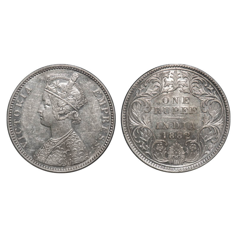 Victoria Empress, Silver, Rupee, 1882, Bombay Mint, A3/I, Dot, The Queens jabot has 3 & 3/4 panels. F. Prid 160. GK 474. About Uncirculated. Very Scarce.