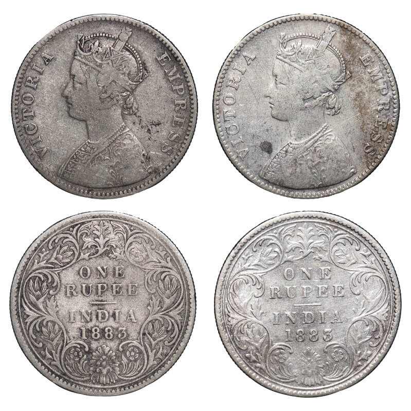 | Victoria Empress, Silver, Rupee, (2 coins), 1883, 1) Bombay Mint, A3/I, 'B' raised, 2) Calcutta Mint, A1/I, No mint mark, Over date on numeral 3 of year 1883. F. Prid 164, Unlisted. GK 483, 485. Very Fine to Very Fine+. Very Scarce. |
