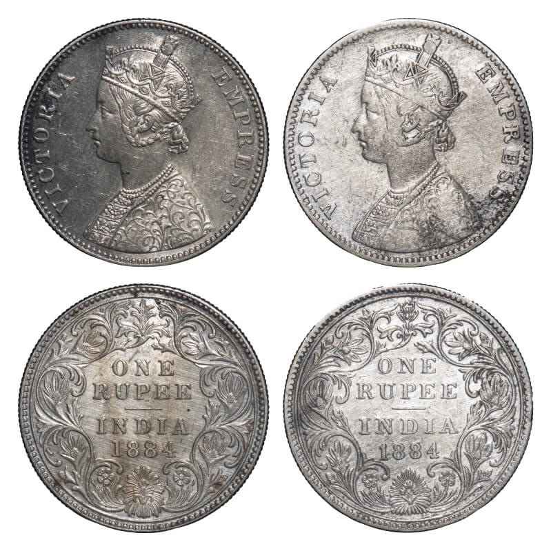 | Victoria Empress, Silver, Rupee, (2 coins), 1884, Bombay Mint, 1) A3/II(i), 'B' raised bottom, 2) A3/I, 'B' raised. F. Prid 166, 167. GK 487, 489. Very Fine to About Uncirculated. Very Scarce. |
