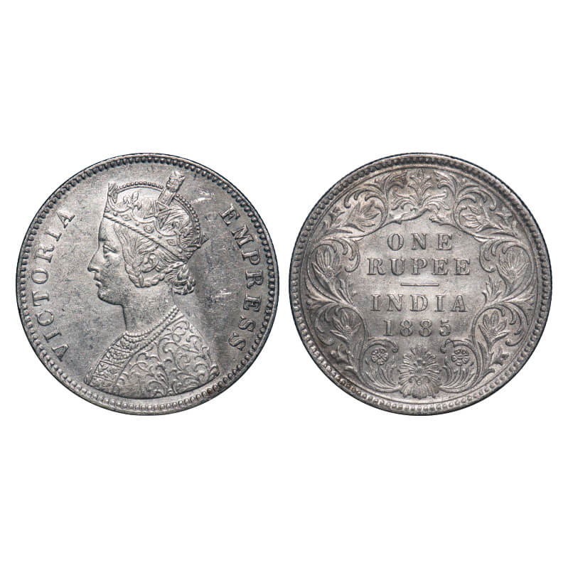 | Victoria Empress, Silver, Rupee, 1885, Calcutta Mint, A1/I, 'C' incused, Top stroke of numeral 5 short, The Queen's jabot has 3 & 3/4 panels. F. Prid 124. GK 518. About Uncirculated. Very Scarce. |