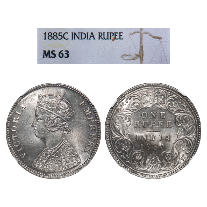 Victoria Empress, Silver, Rupee, 1885, Calcutta Mint, A1/I, 'C' incused, Top stroke of numeral 5 short. F. Prid 124. GK 518. NGC Slabbed MS 63. Extremely Rare.