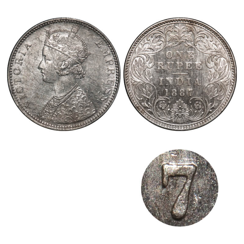 Victoria Empress, Silver, Rupee, 1887, Bombay Mint, C2/I, 'B' incused, Traces of numeral 6 seen behind numeral 7. F. Prid 173. GK 540. Almost Uncirculated. Very Rare.