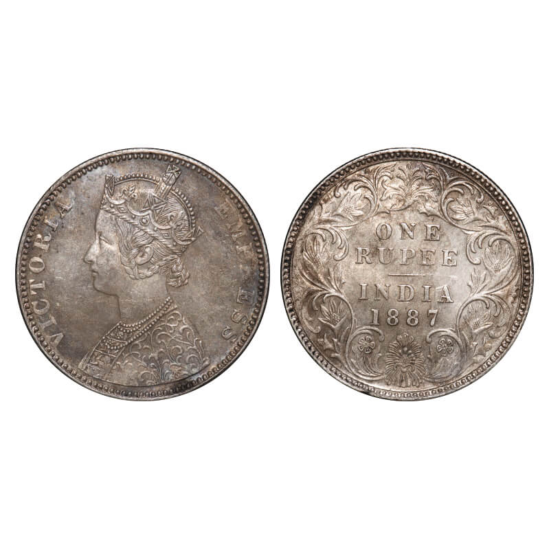 | Victoria Empress, Silver, Rupee, 1887, Bombay Mint, C2/I(ii), 'B' incused, 'B' incused (inverted), The Queen's jabot has 3 & 1/2 panels, No privy marks seen, Ghost on Rev. F. Prid Unlisted. GK 546. Uncirculated, Toned. Rare. |
