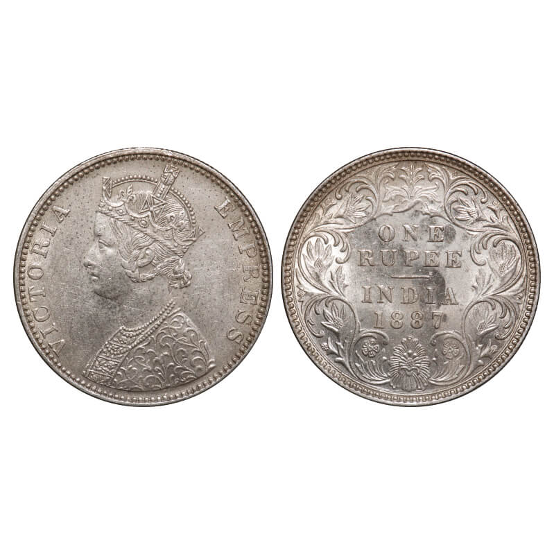 | Victoria Empress, Silver, Rupee, 1887, Bombay Mint, C2/I(ii), 'B' incused, B incuse inverted, Die crack on Obv, Ghost on Rev, Numeral 7 seen behind the neck at Obv. F. Prid Unlisted. GK 546. Amost Uncirculated, Toned. Very Scarce. |