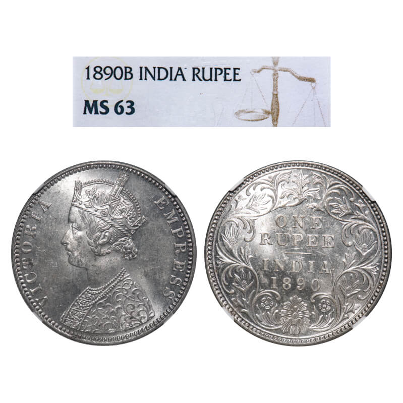 Victoria Empress, Silver, Rupee, 1890, Bombay Mint, C2/I, 'B' incused. F. Prid 178. GK 566. NGC Slabbed MS 63. Very Rare. (28 coins graded higher by NGC in this category till 10/9/2025)