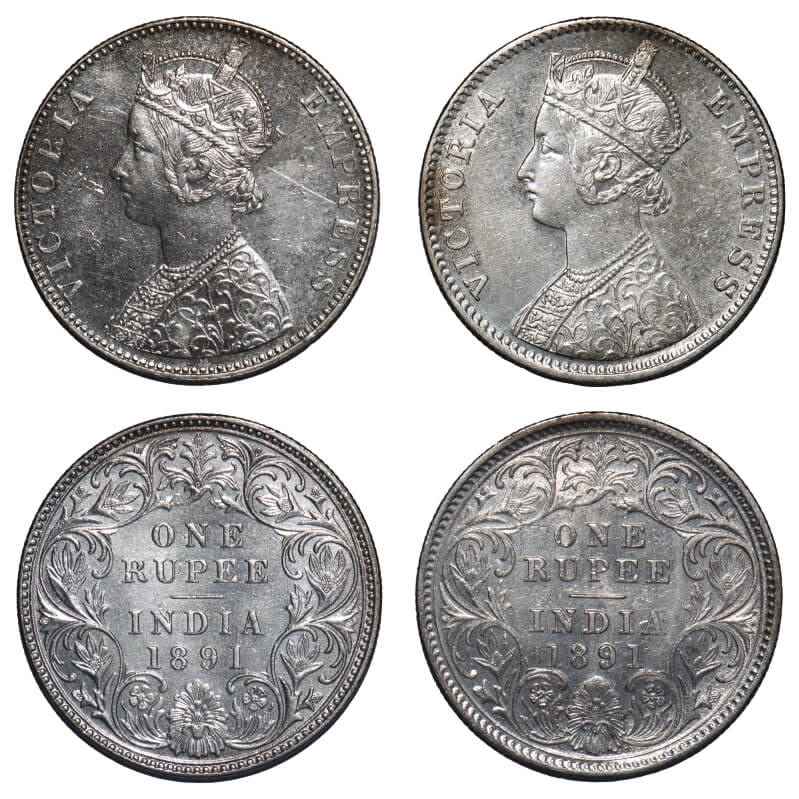 | Victoria Empress, Silver, Rupee, (2 coins), 1891, 1) Bombay Mint, C2/I, 'B' incused, 2) Calcutta Mint, C3/I(i), 'C' incused. F. Prid 179, 132. GK 569, 570. Almost Uncirculated to Uncirculated. Rare. |