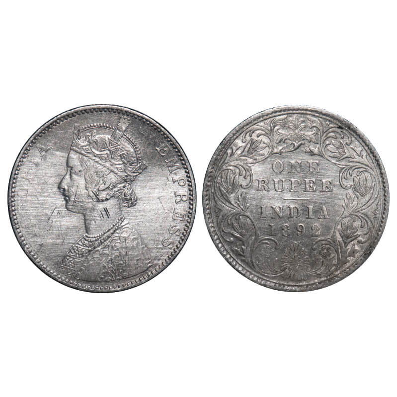 | Victoria Empress, Silver, Rupee, 1892, Bombay Mint, C2/I(ii), 'B' incused, The Queen's jabot has 3 & 1/2 panels, The top flower petal is hallow and has a thick vertical stroke. F. Prid Unlisted. GK 573. Very Fine+. Very Scarce. |