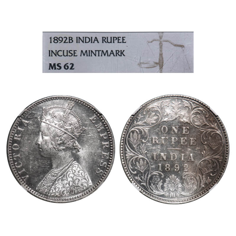 Victoria Empress, Silver, Rupee, 1892, Bombay Mint, C2/I(ii), 'B' raised. F. Prid 180. GK 575. NGC Slabbed MS 62. Very Rare.