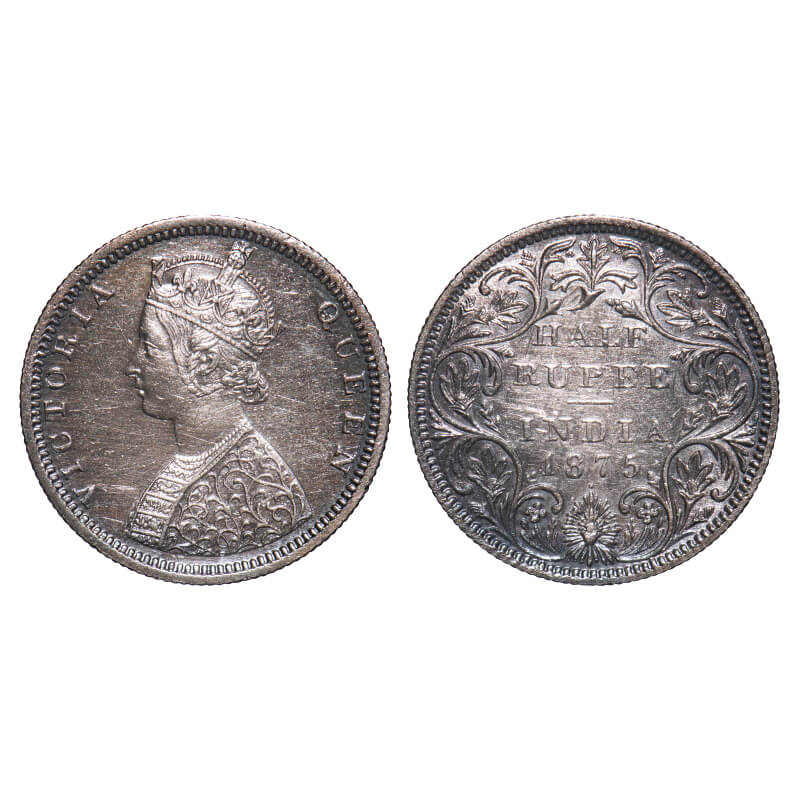 | Victoria Queen, Silver, Half Rupee, 1875, Bombay Mint, B2/II, Dot, Queen's jabot has 4 & 1/4 panels, The numeral 1 of year has an oblique top serif, Edge nick on Obv & Rev rim edge. F. Prid 286. GK 602. About Uncirculated, Toned. Rare. |
