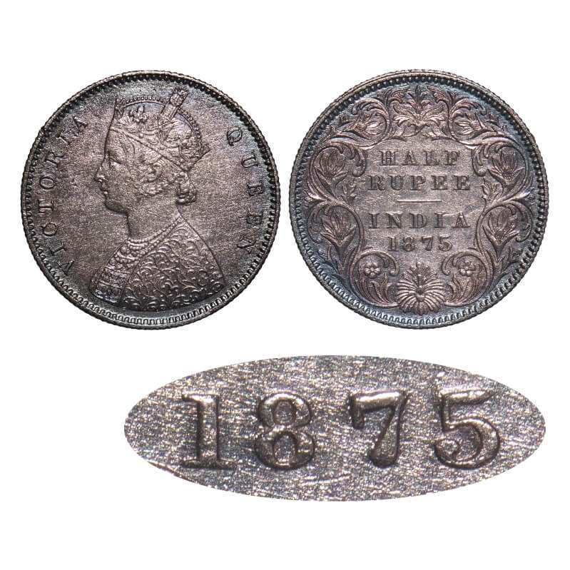| Victoria Queen, Silver, Half Rupee, 1875, Calcutta Mint, A/I, No mint mark, Queen's jabot has 4 complete panels, The numeral 1 of year has an short horizontal serif, Tilted numeral 7 to left side, The top flower has incused effect on Rev. F. Prid 260. GK 604. Extremely Fine+, Toned. Rare. |