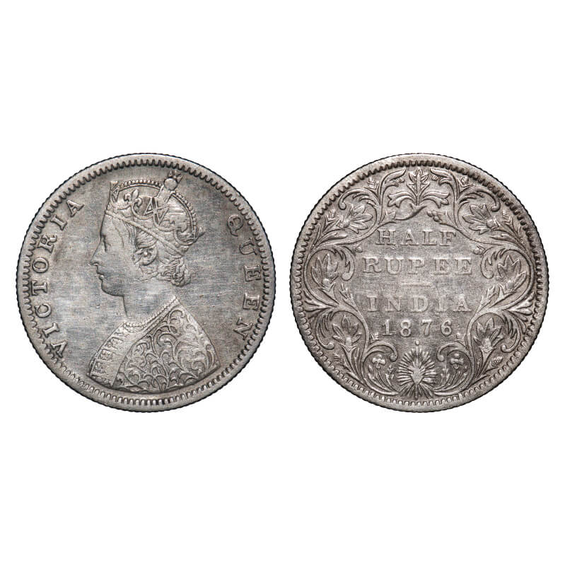 Victoria Queen, Silver, Half Rupee, 1876, Bombay Mint, B2/II, Dot, Queen's jabot has 4 & 1/4 panels...