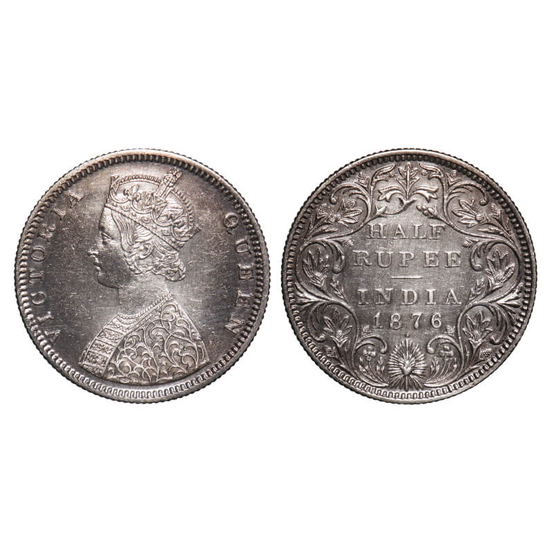 | Victoria Queen, Silver, Half Rupee, 1876, Bombay Mint, B2/II, Dot, Queen's jabot has 4 & 1/4 panels, The numeral 1 of year has an oblique top serif, Edge nick on Rev rim edge. F. Prid 287. GK 606. Uncirculated. Very Rare. |