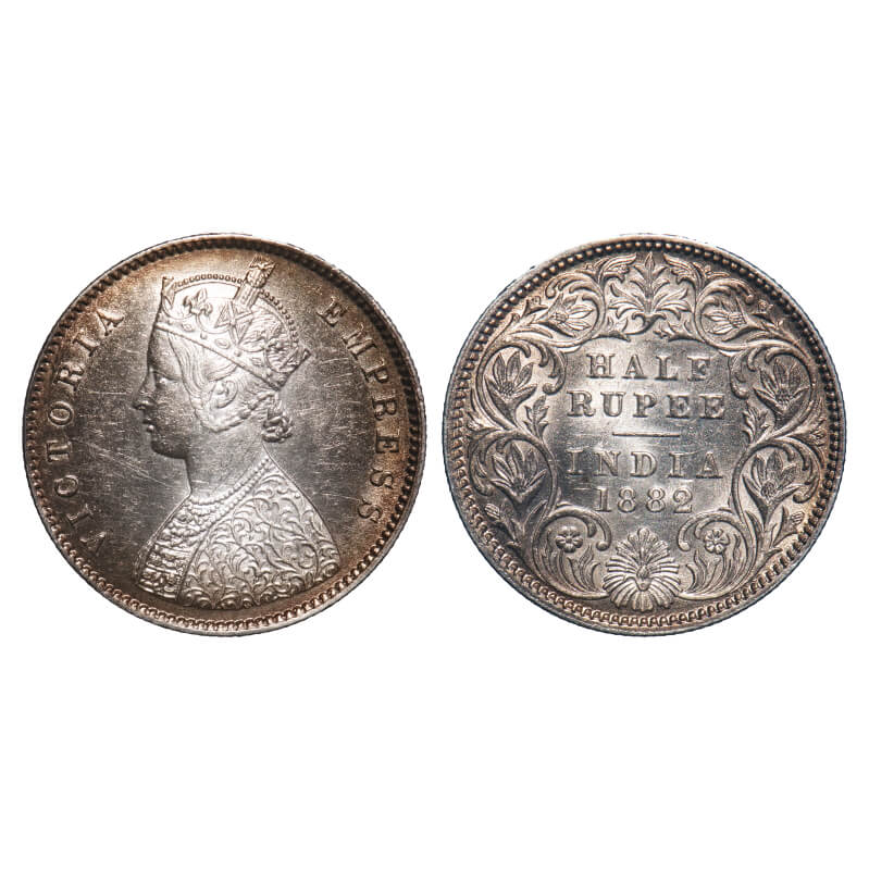 | Victoria Empress, Silver, Half Rupee, 1882, Calcutta Mint, A/I, 'C' incused, Edge nick on Obv & Rev rim edge. F. Prid 266. GK 621. Almost Uncirculated, Toned. Very Rare. |