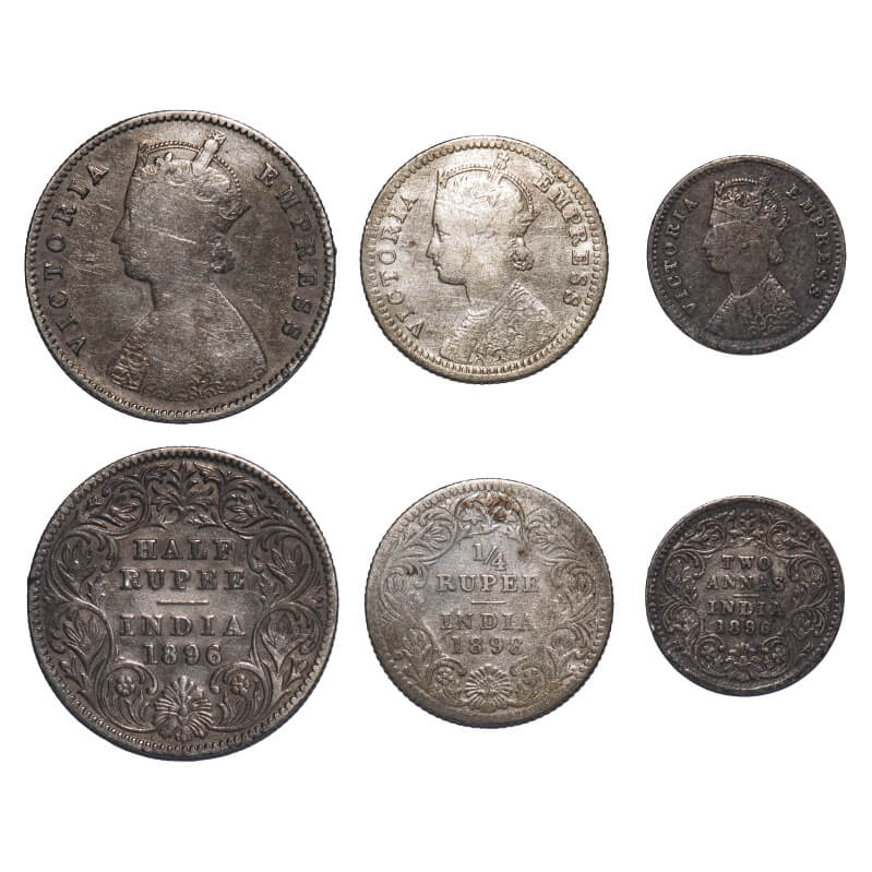 | Victoria Empress, Silver, (3 coins), 1) Half Rupee, 1896, Calcutta Mint, A/I, 'C' incused, 2) 1/4 Rupee, 1898, Calcutta Mint, C/II, 'C' incused, 3) 2 Annas, 1896, Bombay Mint, B/II, 'B' incused. F. Prid 279, 402, 550. GK 652, 735, 804. Fine to Very Fine+. Scarce. |