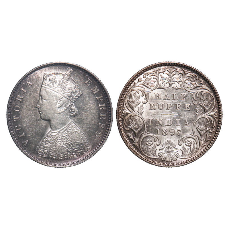 Victoria Empress, Silver, Half Rupee, 1897, Calcutta Mint, A/I, 'C' incused. F. Prid 280. GK 657. About Uncirculated, Toned. Very Rare.