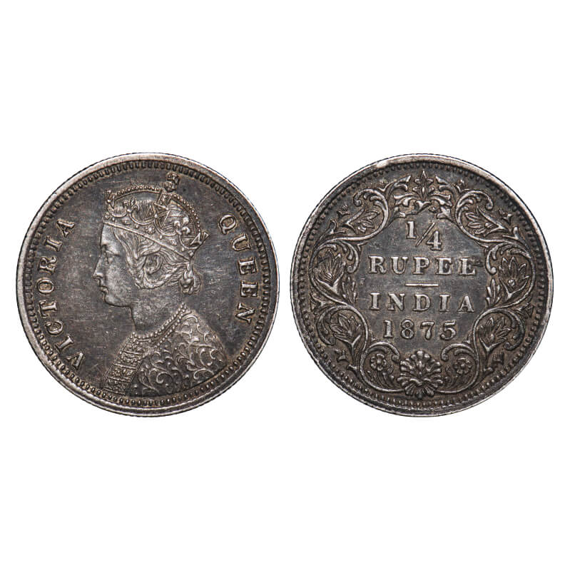 Victoria Queen, Silver, 1/4 Rupee, 1875, Bombay Mint, A/I, No dot. F. Prid 406. GK 666. Extremely Fine. Toned. Rare.