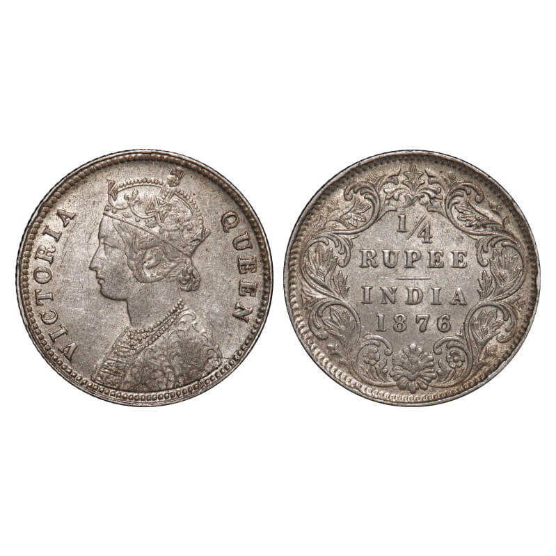 | Victoria Queen, Silver, 1/4 Rupee, 1876, Calcutta Mint, A/I, No mint mark, No 'C', Die crack on Obv. F. Prid. 381. GK 669. Extremely Fine+. Rare. |